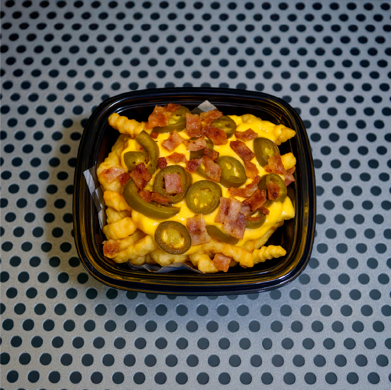 Papas Fritas Crinkle 400 grs, Salsa de Queso Cheddar, Tocino Crispy, Jalapeño Mex.